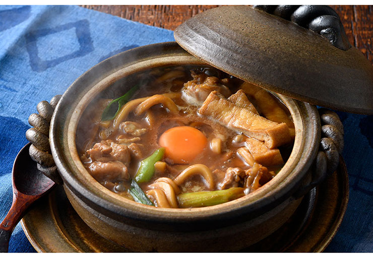 名古屋の老舗「山本屋総本家」の名物がこちら。地元岡崎産の八丁味噌と愛知県産白味噌を合わせたスープは、コク深くまろやか。そこに国内産小麦粉100%の太く噛み応えのある生麺が調和する、これぞ伝統の味。具材はお好みで。土鍋で煮込んで熱々をぜひ。
