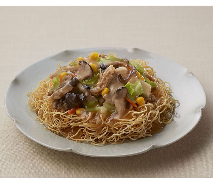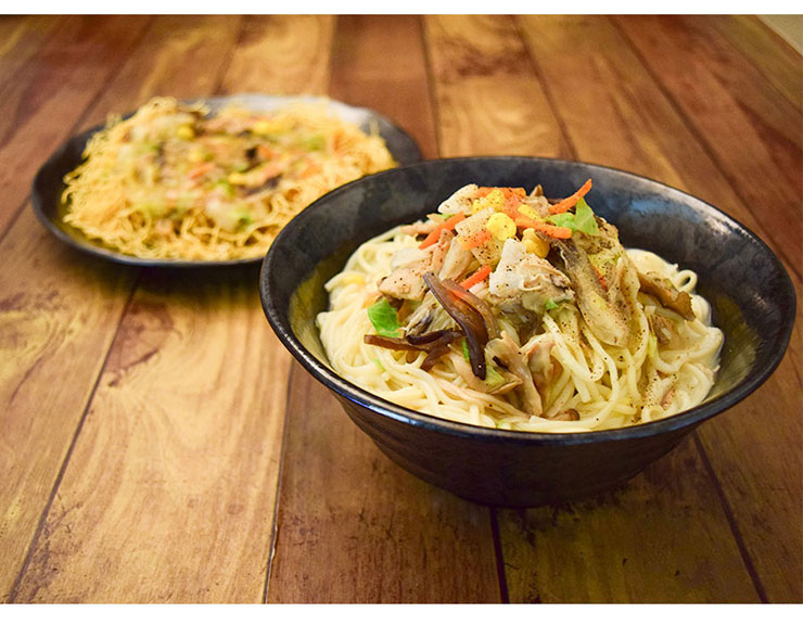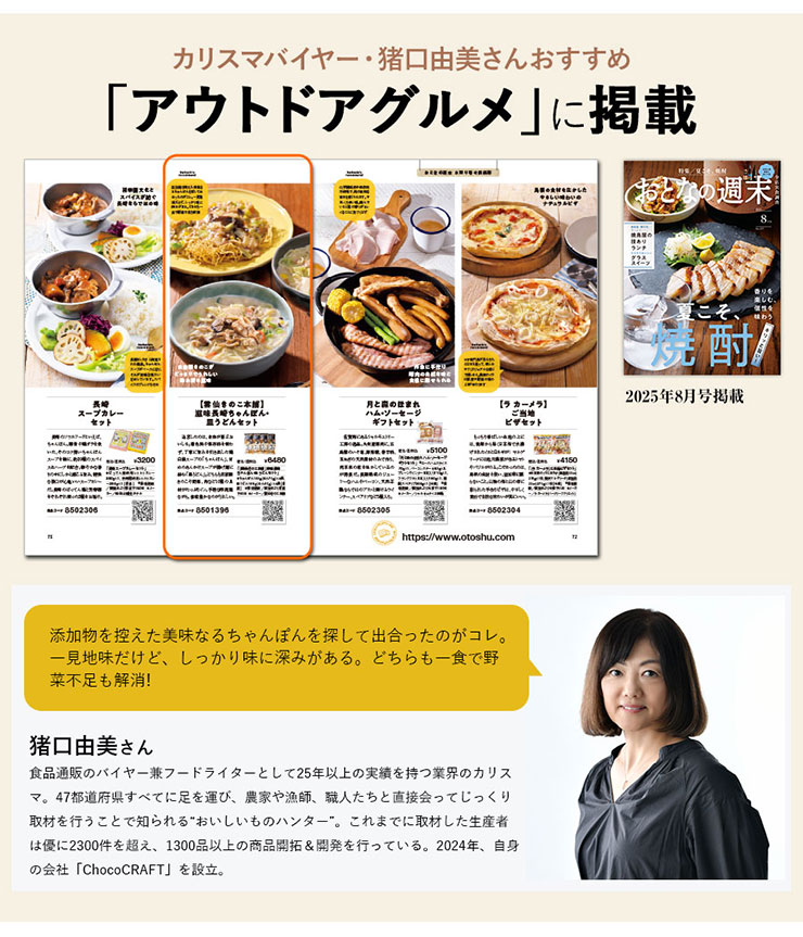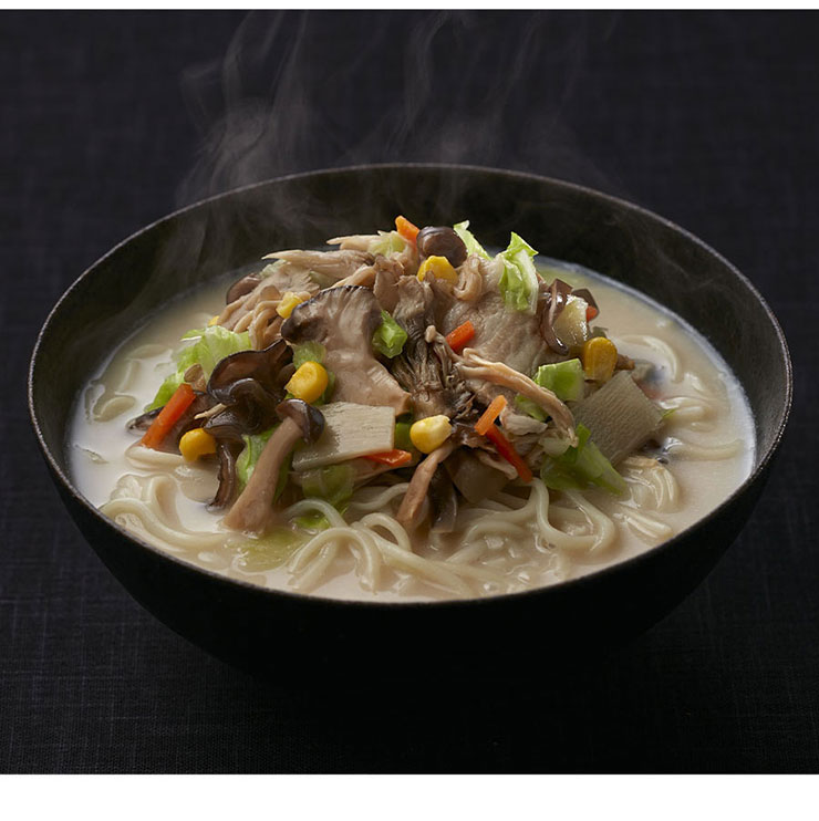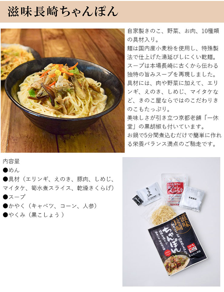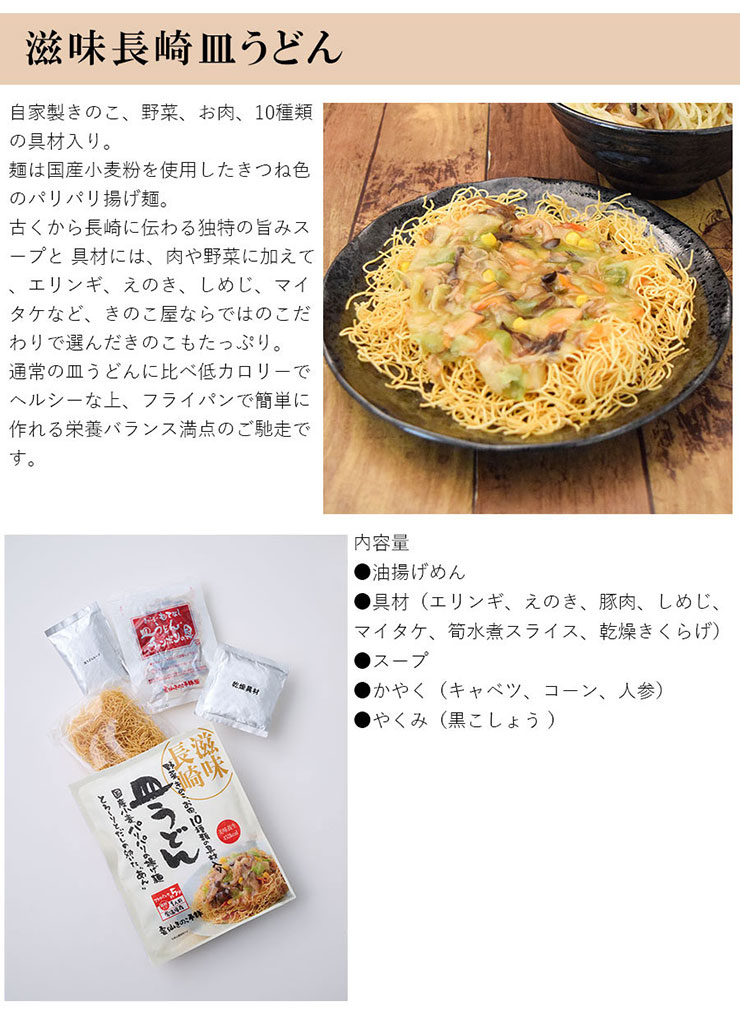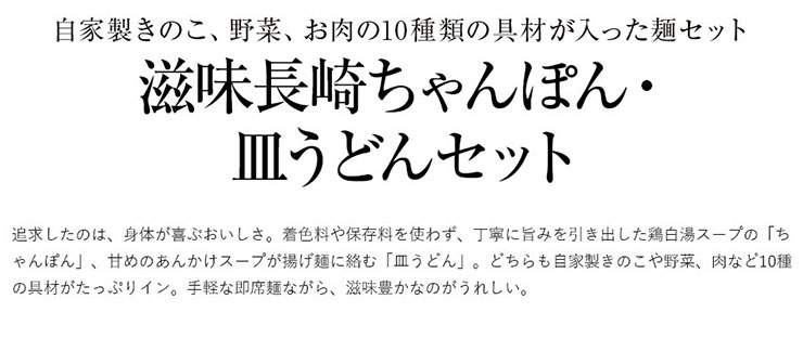 追求したのは、身体が喜ぶおいしさ。着色料や保存料を使わず、丁寧に旨みを引き出した鶏白湯スープの「ちゃんぽん」、甘めのあんかけスープが揚げ麺に絡む「皿うどん」。どちらも自家製きのこや野菜、肉など10種の具材がたっぷりイン。手軽な即席麺ながら、滋味豊かなのがうれしい。