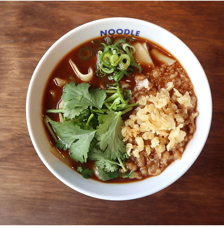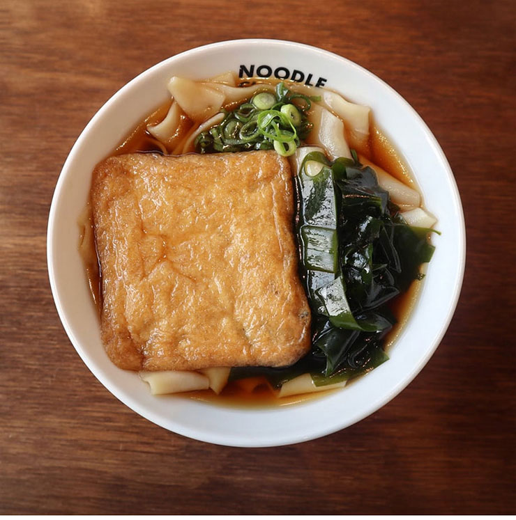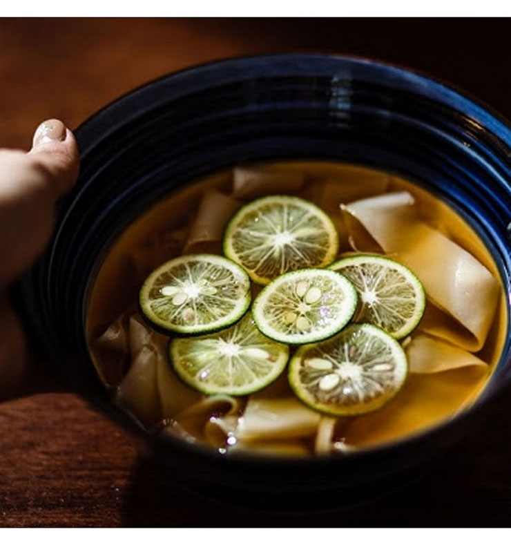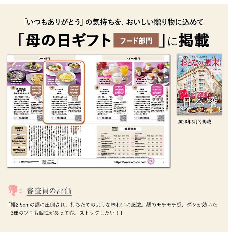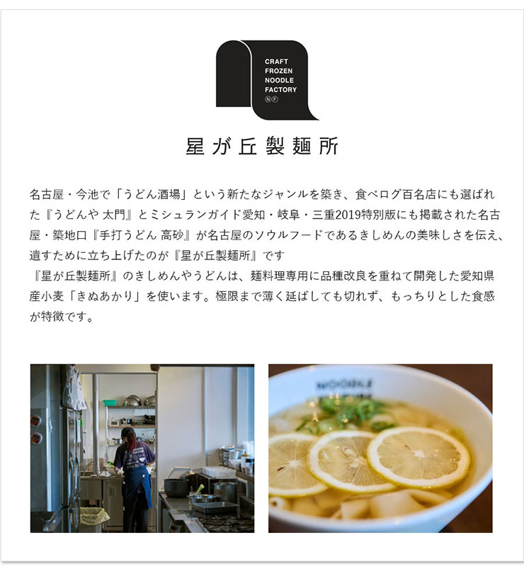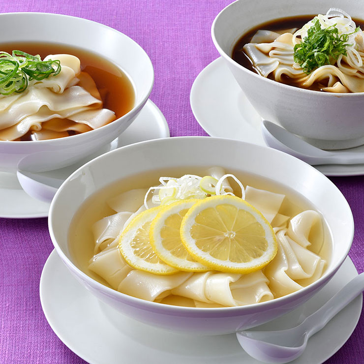 名古屋のご当地麺・きしめんを気軽に味わえるセット。愛知県産小麦粉“きぬあかり”で仕立てた幅広麺は、モチッとしつつツルリとしたのど越しが心地よい。ムロアジダシが香る、赤(たまり醤油)・白(白醤油)・味噌(赤味噌)の3種のツユで、温かくも冷たくも楽しめる。