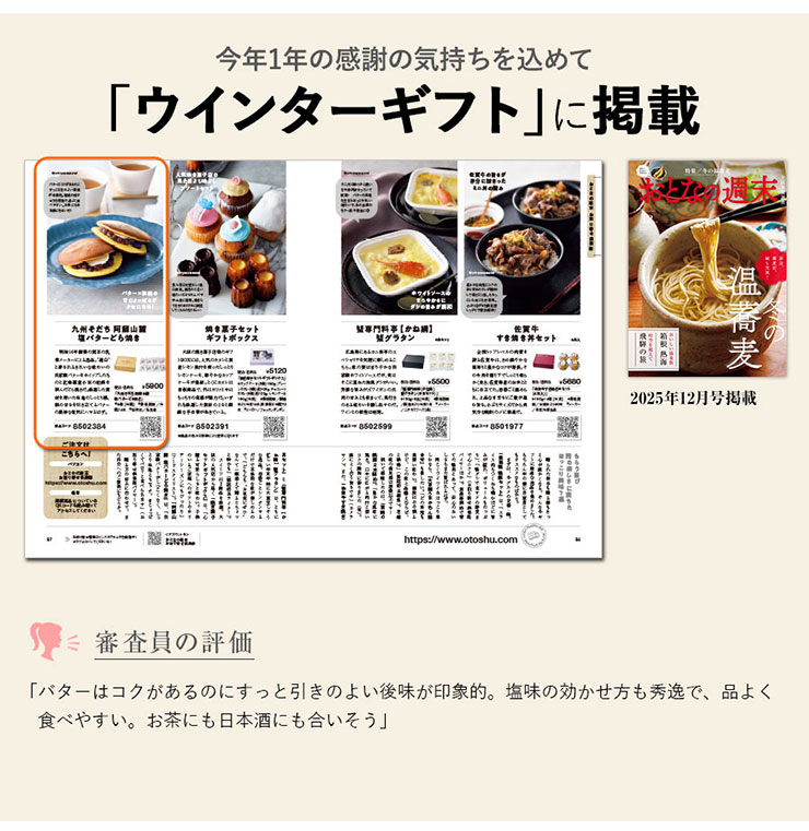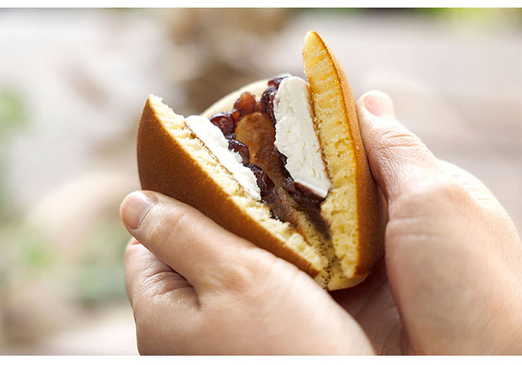 明治16年創業の熊本の乳業メーカーによる逸品。『純白』と評されるきれいな味わいの自家製バターをホイップしたものと北海道産小豆の粒餡を挟んだどら焼きだ。厳選した素材を用いた生地のしっとり感、餡の甘さを引き立てるバターの絶妙な塩気にハマるはず。