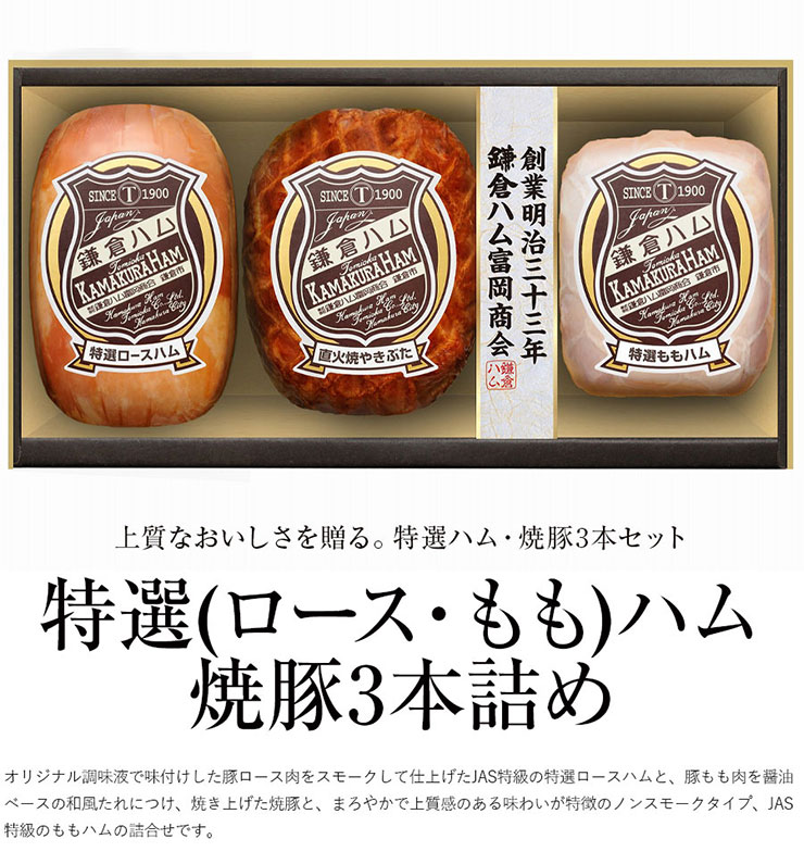 特選(ロース・もも)ハム・焼豚3本詰め 神奈川県 ギフト 焼豚 ハム チャーシュー お中元 お歳暮 年末 贈答