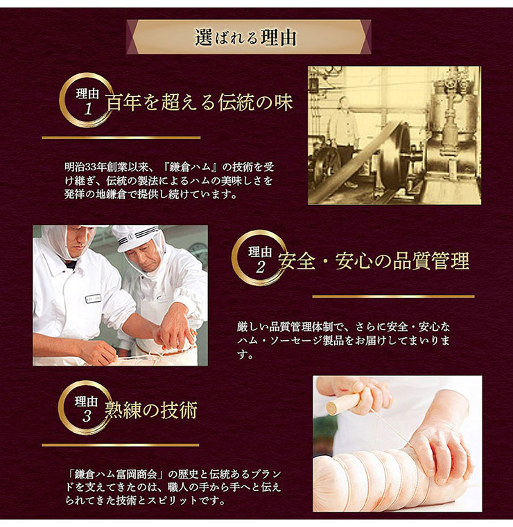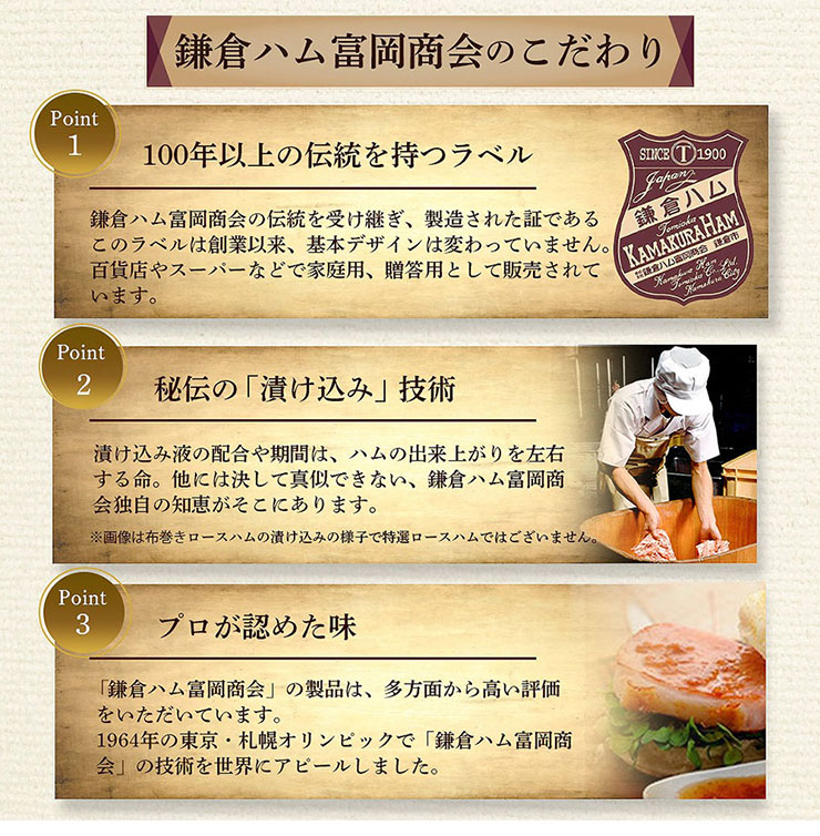 〇名称:特選(ロース・もも)ハム・焼豚3本詰め 〇内容量:特選ロースハム320g、直火やきぶた170g、特選ももハム(ホワイト)270g 〇原材料名:特選ロースハム320g:豚ロース肉(輸入)、糖類(水あめ、ぶどう糖、砂糖)、食塩、酵母エキス/リン酸塩(Na)、酸化防止剤(ビタミンC)、調味料(アミノ酸)、発色剤(亜硝酸Na)、香辛料、(一部に豚肉を含む) 直火焼やきぶた170g:豚もも肉(アメリカ又はカナダ)、醤油、発酵調味料、濃縮りんご果汁、食塩、豚コラーゲン、ポークエキス、水あめ/調味料(アミノ酸等)、リン酸塩(Na)、着色料(カラメル)、保存料(ソルビン酸K)、甘味料(ステビア)、香辛料、(一部に小麦・大豆・豚肉・りんごを含む) 特選ももハム270g:豚もも肉(アメリカ又はカナダ)、食塩、砂糖、香辛料/リン酸塩(Na)、酸化防止剤(ビタミンC)、調味料(アミノ酸)、発色剤(亜硝酸Na)、(一部に豚肉を含む) 〇配送形態:冷蔵 (宅配BOX・置配不可) 〇保存方法:冷蔵 〇賞味期限:冷蔵55日 〇熨斗:可 〇名入れ:可 〇包装:可 〇手提げ:不可 〇荷姿:化粧箱 〇備考:冷蔵商品です。 ○製造者:【株式会社鎌倉ハム富岡商会】 〒247-0051 神奈川県鎌倉市岩瀬 961番地