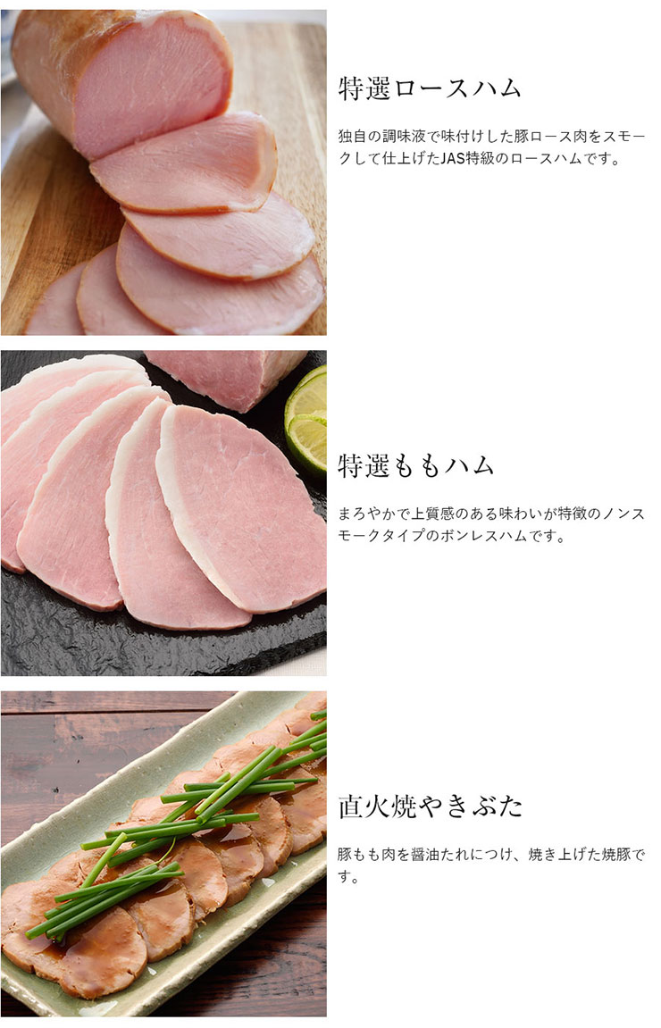 スモークタイプのロースハムと醤油ベースの和風たれで味付けした直火焼焼豚とホワイトももハムの3本セットです。