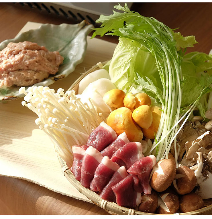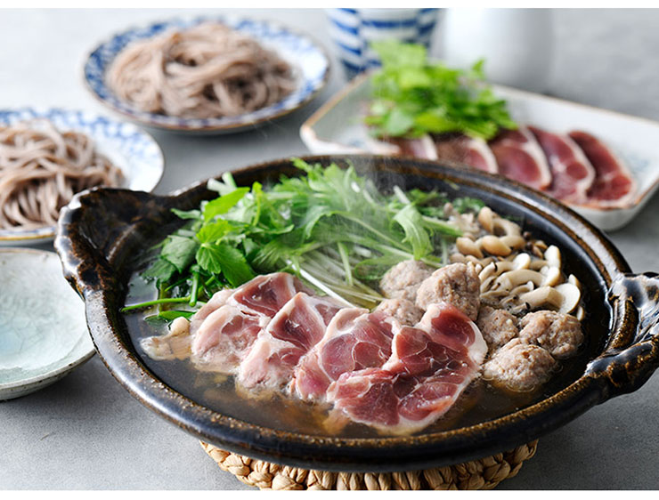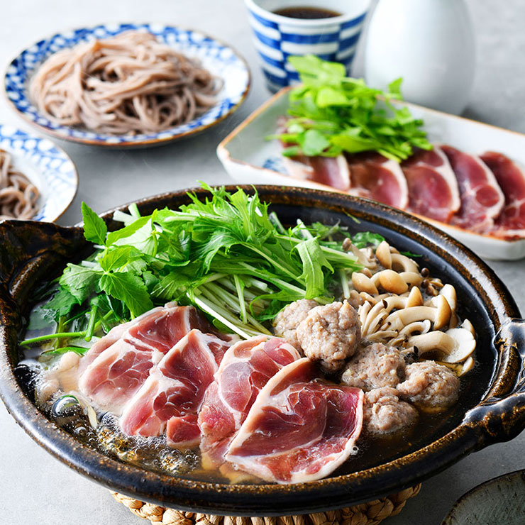 兵庫県新温泉町でお米中心の無農薬飼料&平飼いで育てられた但馬鴨を使用。クセがなく噛むほどに味わい深いスライス肉と力強い旨みが凝縮したつくねを、秘伝の鴨ダシでいただく鍋セットだ。〆の出石そばまで付く充実の内容で、鴨肉の滋味を味わい尽くせる。