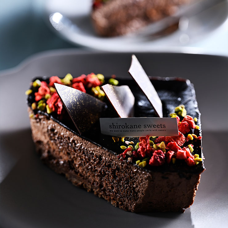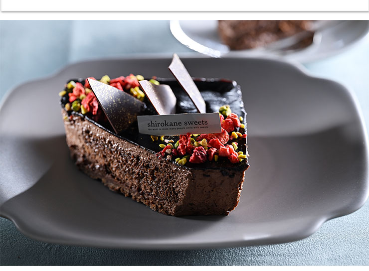 艶やかなケーキには最高品質のカカオを贅沢に使用。しっとりとしたジェノワーズとムースを濃密に重ね、ショコラの華やかな香りと力強いカカオ感が存在感を放つ。冷蔵解凍後、少し常温に戻すと香りがぐっと豊かに。同梱のトッピングも名脇役なので飾りつけとともに楽しんで。