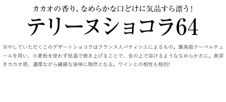 冷やしていただくこのデザートショコラはフランス人パティシエによるもの。最高級クーベルチュールを用い、小麦粉を使わず低温で焼き上げることで、舌の上で溶けるようななめらかさに。奥深きカカオ感、濃厚ながら繊細な後味に陶然となる。ワインとの相性も格別!