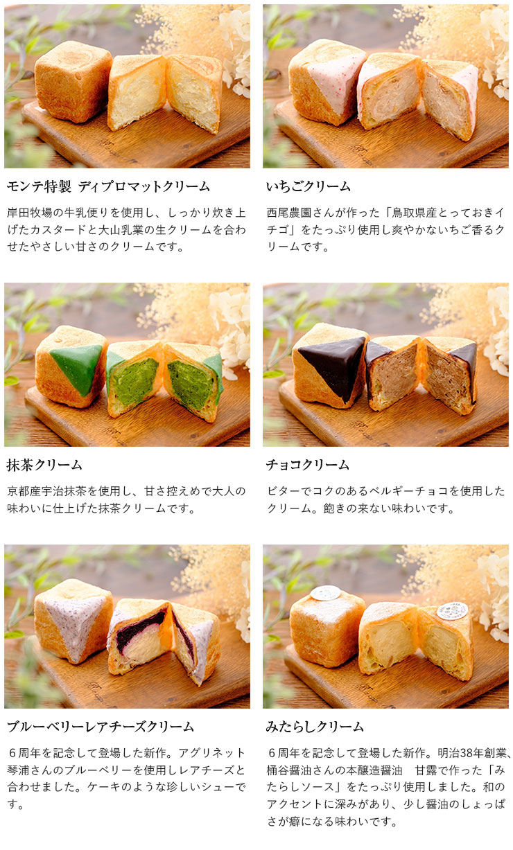 四角いシュー生地に詰めたのは、鳥取県の豊かな恵み。地元岸田牧場の牛乳を用いた「特製クリーム」、老舗・桶谷醤油の本醸造醤油が香る甘じょっぱい「みたらし」など6種。クリームたっぷりだけど、不思議と軽くもたれない。冷凍のままアイス感覚で食べても◎。