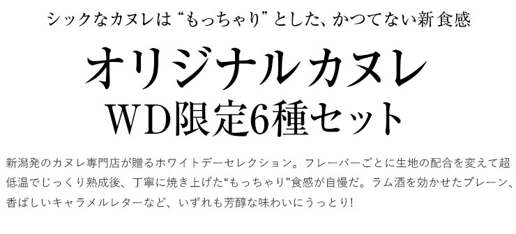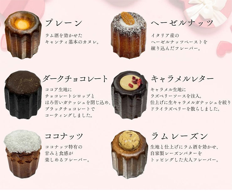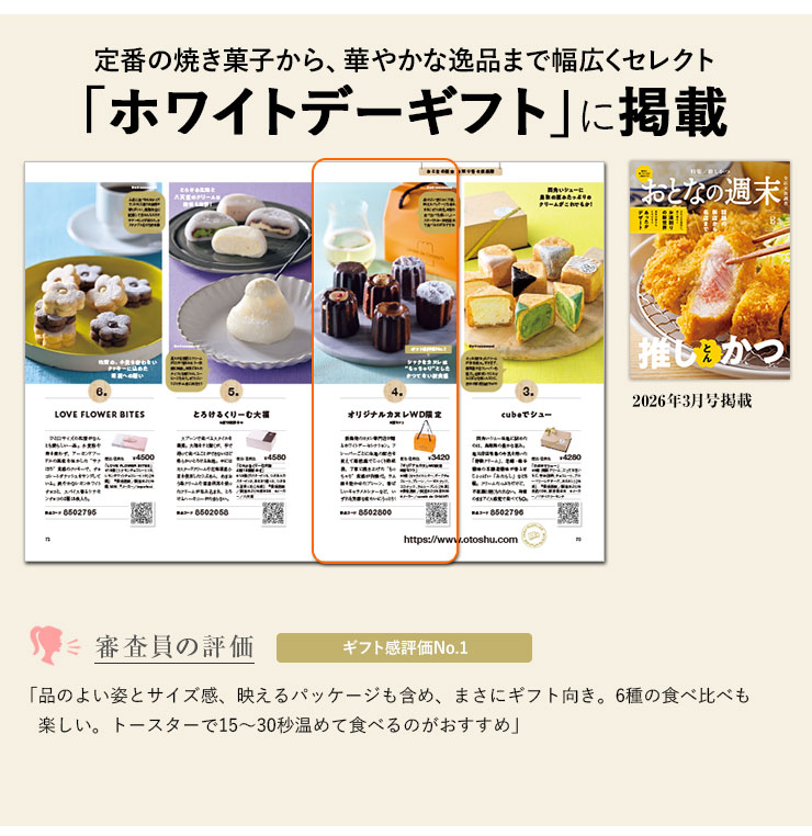 新潟発のカヌレ専門店が贈るホワイトデーセレクション。フレーバーごとに生地の配合を変えて超低温でじっくり熟成後、丁寧に焼き上げた“もっちゃり”食感が自慢だ。ラム酒を効かせたプレーン、香ばしいキャラメルレターなど、いずれも芳醇な味わいにうっとり!