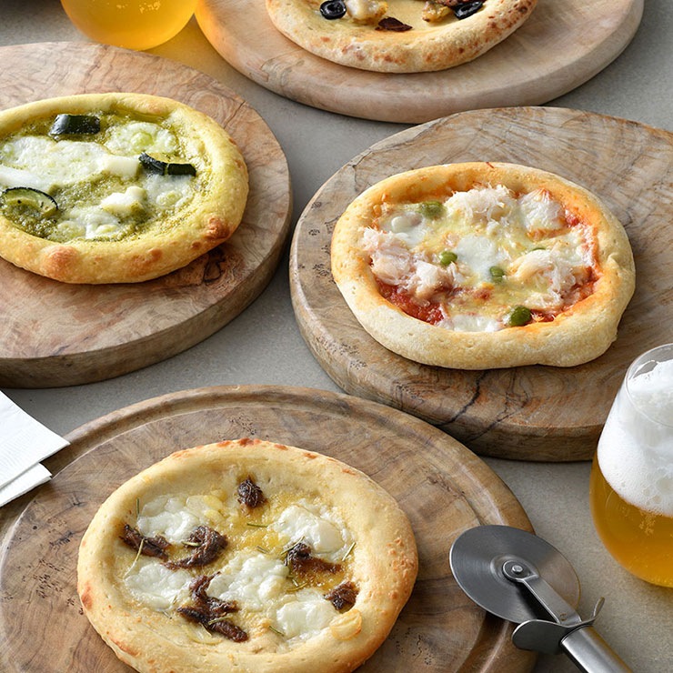 手掛けるのは地産地消イタリアンの旗手・奥田政行シェフ。生地にイタリア産酵母を使い、2日間かけて熟成発酵。もちもち感と粉の旨みが際立つクラフトピザだ。ズワイガニにだだちゃ豆を合わせたり、ローストイカをバジルで引き立てるなど具材の組み合わせの妙も光る。